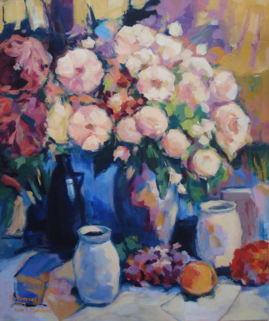 Bloemstilleven met blauwe fles naar F Manders