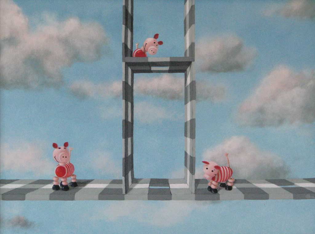 Houten varkentjes, ze zijn misschien een beetje de weg kwijt in deze geblokte omgeving? Maar zo te zien zijn ze evengoed toch blij.