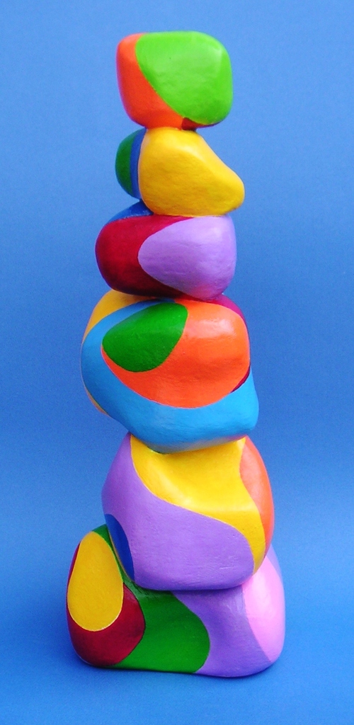 Kleurige plastiek. Als basis Styrofoam, afwerking met acrylverf en vernis.