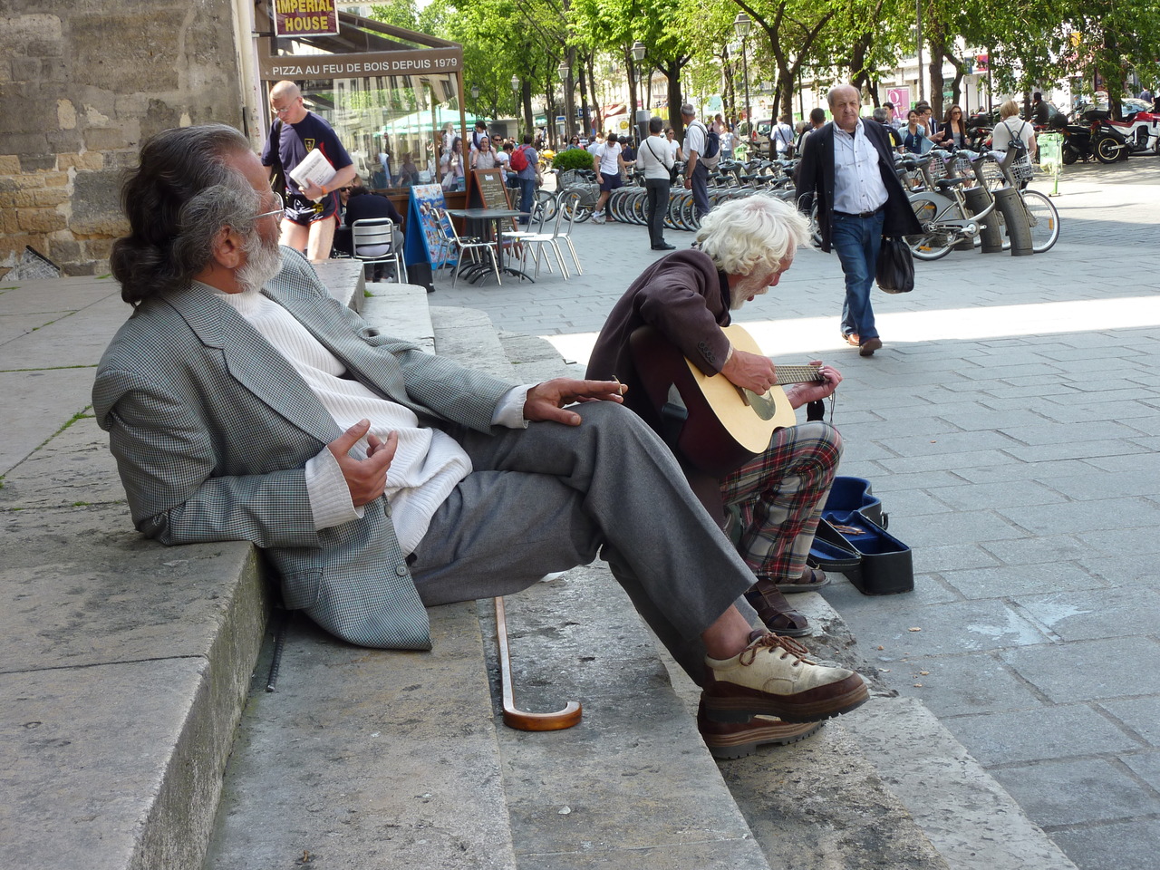 De clochardj rookt zijn sigaretje op straat en luisterd naar de gitaar van zijn vriend