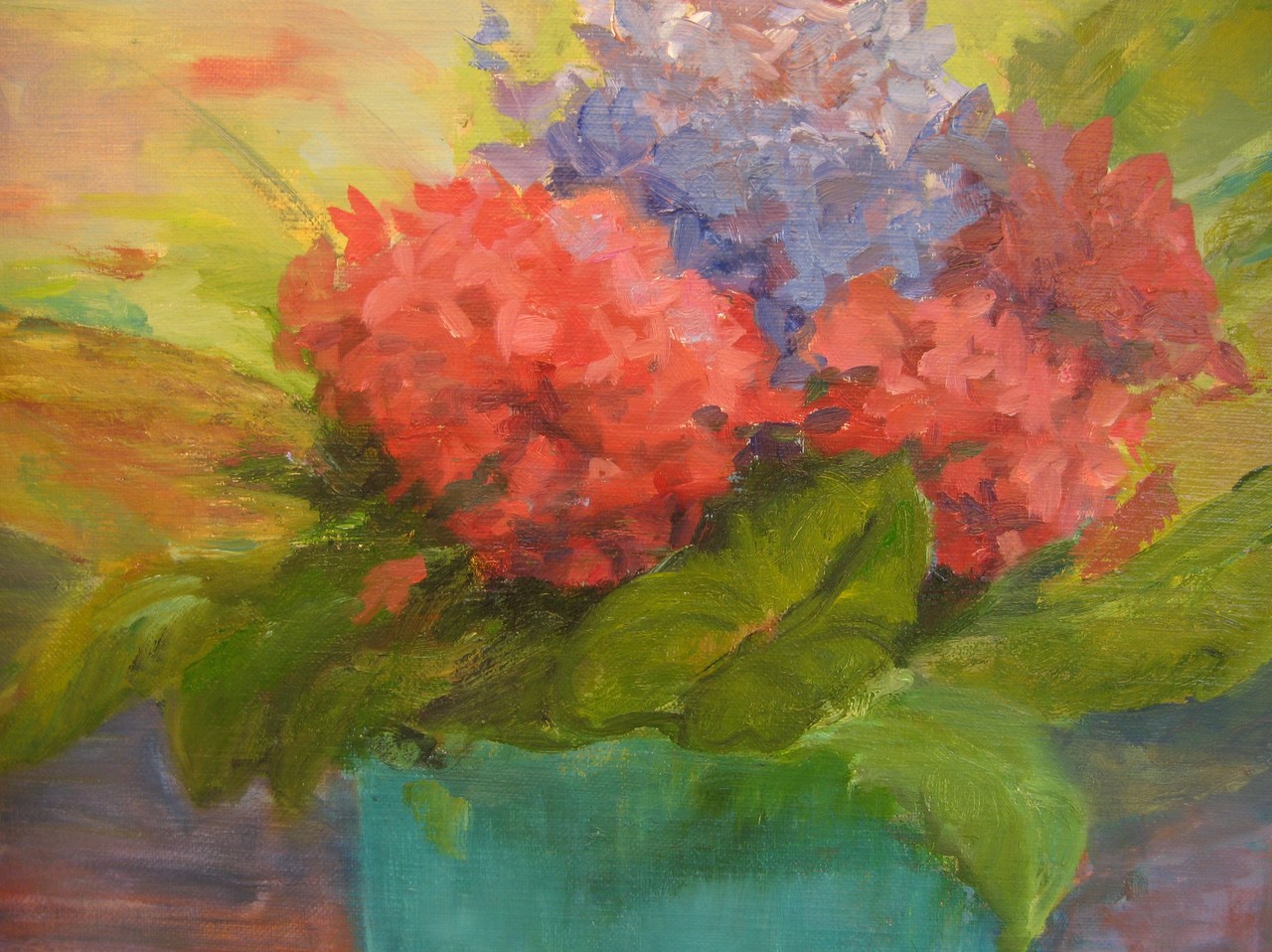 Hortensia's, overvloedig bloeiend in mijn tuin als het zomer is...... olieverf op linnen 30 x 40 cm