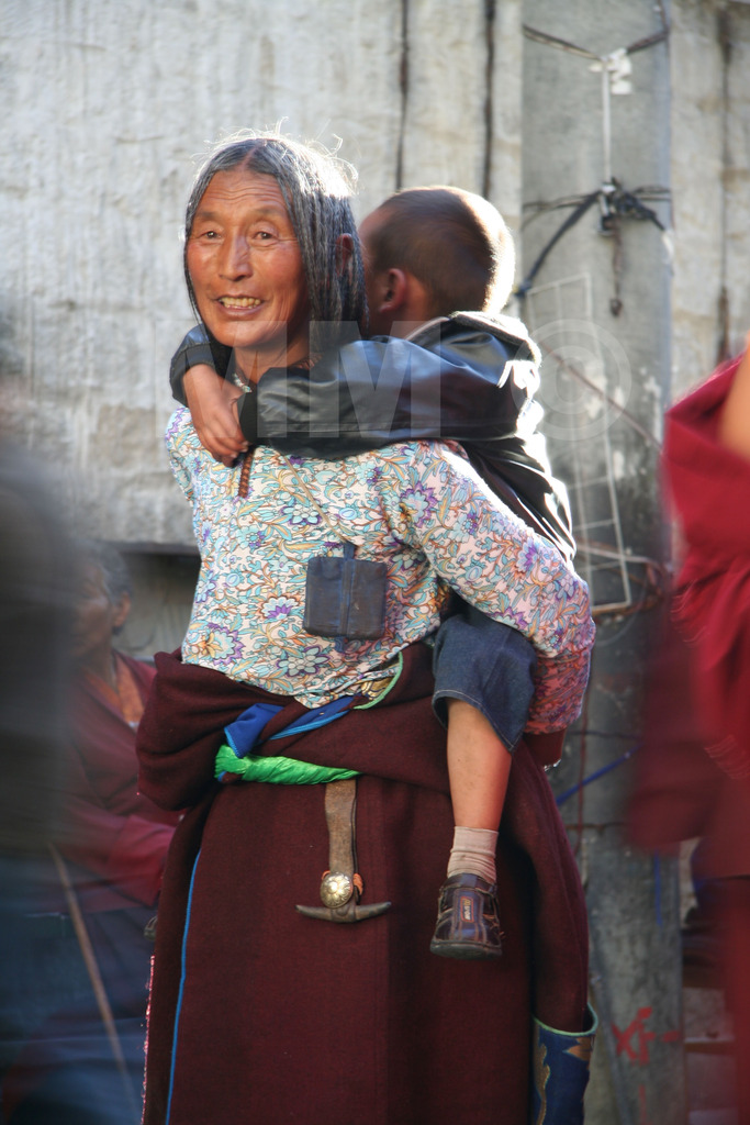 Deze moeder en haar kind staan heel even geconcentreerd en verstild midden in de hectiek van de stad Lhasa.
