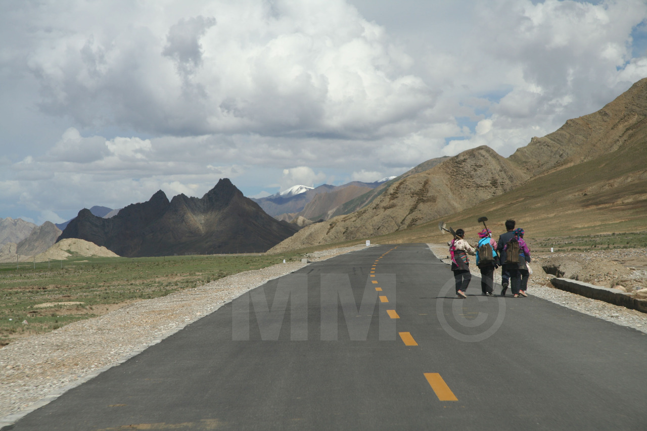 Deze groep Tibetanen met traditionele voertuigen en kleding contrasteert in het landschap dat steeds moderner wordt.