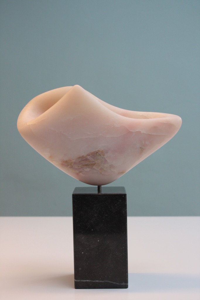 Beeld in Chinees speksteen op hardstenen sokkel. Half transparant door dunne lijnen. Prijs inclusief btw en commissie bij galerie aankoop. Aankoop buiten exposities ook mogelijk bij de kunstenaar.