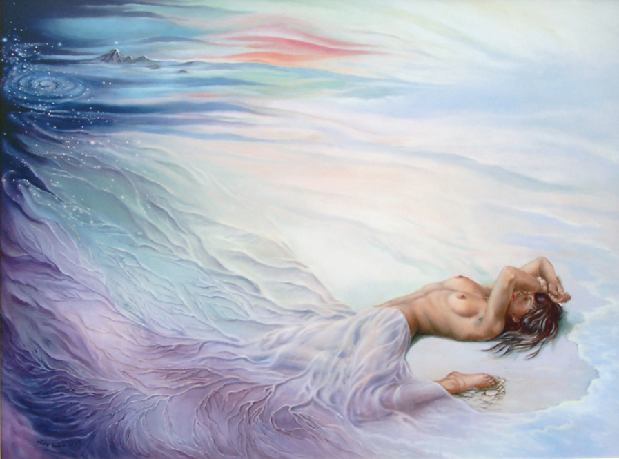 Het water en de vrouw, voor eeuwig vloeiend in elkaar overgaand en opgaand, gevend en nemend. Van het origineel is een hoogwaardige Giclée te bestellen voor E600,-.
