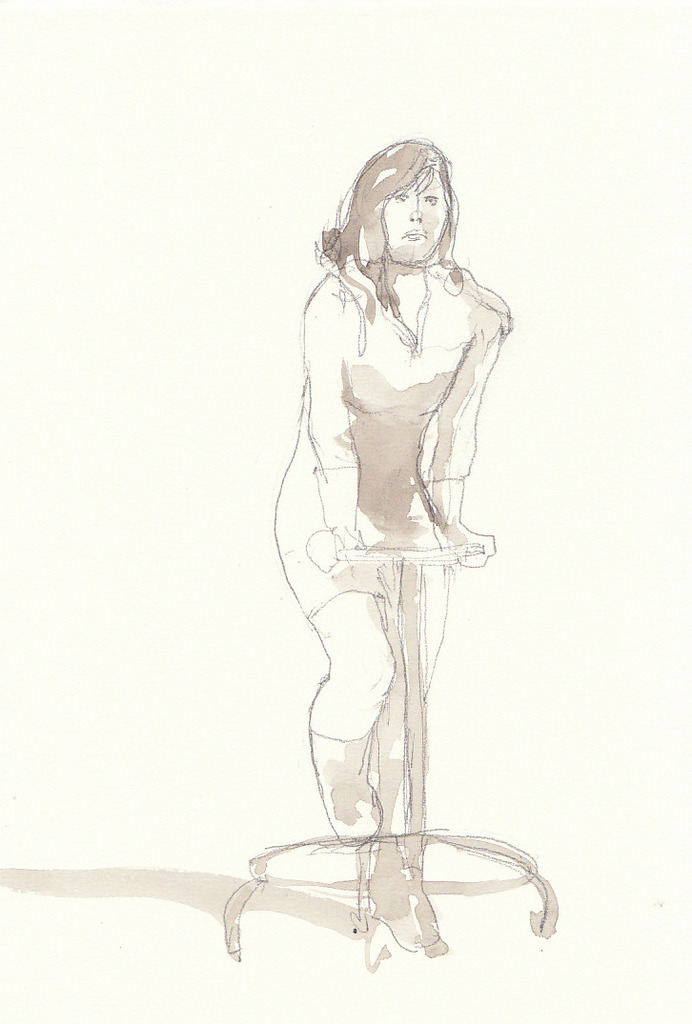 Steunend op een stoel. Binnen de 15 a 20 minuten moet alles erop staan. Dan is er een andere pose.