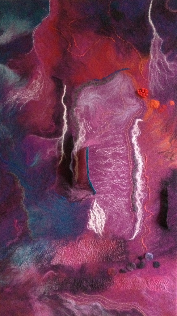 Tijdens het ontstaan van dit werk bleef ik maar witte wol onttwijnen die zich ontpopte tot bliksem. Het blauw werd de onstuimigheid van de zee en het subtiele blauwe draadje sint Elmusvuur.