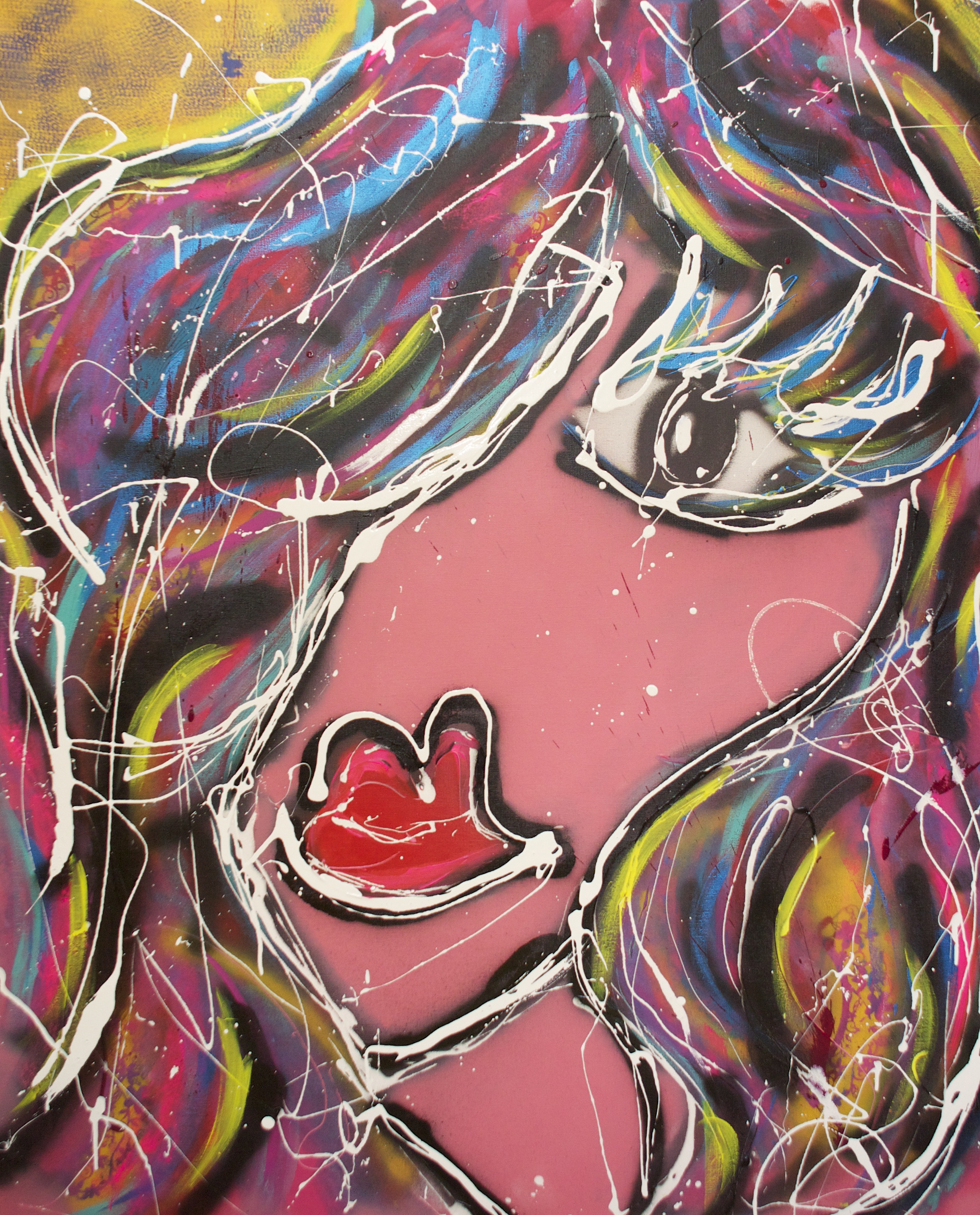 Moderne kunst in Neo-popart stijl geïnspireerd door Herman Brood en Corneille (CoBrA). Met spuitbussen, rollers en mallen van vliegenmeppers tot kanten strings breng ik emotie op het doek. 'Do you dare to feel'