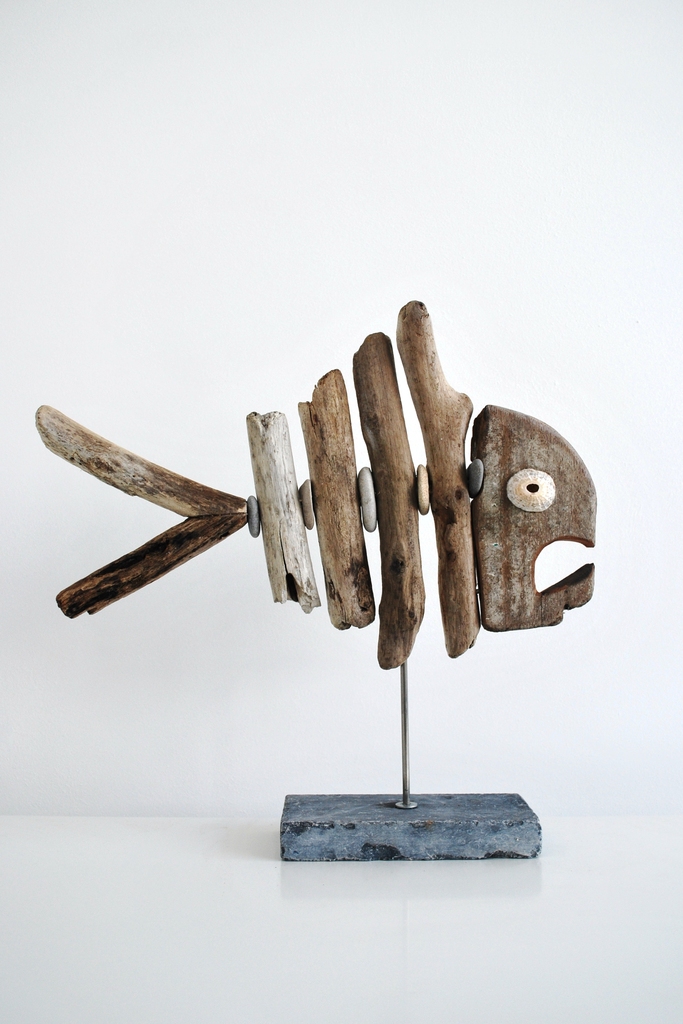 maakt al jaren houten beelden door natuurlijke objecten uit zee te koppelen. De beelden zijn ruw en puur.