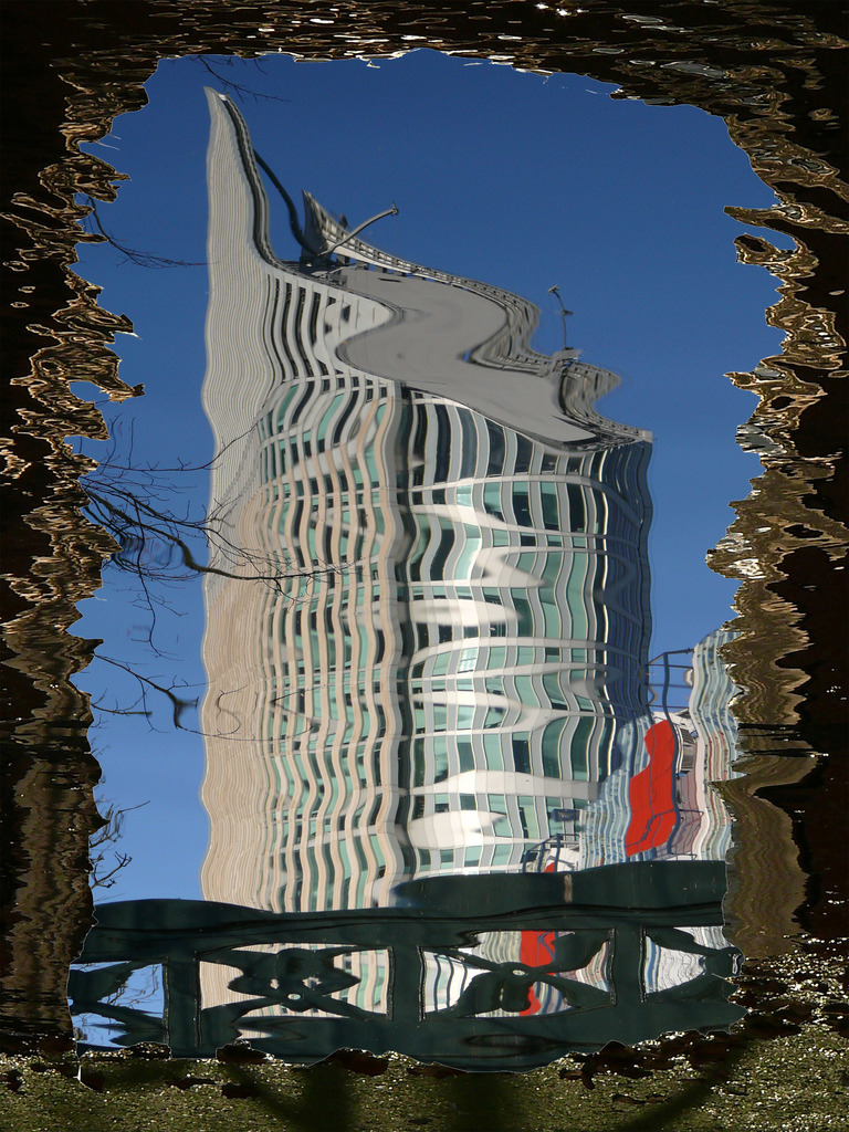 Hoftoren circa 140 m hoge toren van Ministerie van OCW in Den Haag gereflecteerd in de gracht het "Zwarte water". Deze toren wordt door Hagenaars skischans of vulpen genoemd. Ook in "collectie ZomerExpo 2014" (http://zomerexpo.nl/collectie/2014_16463/).