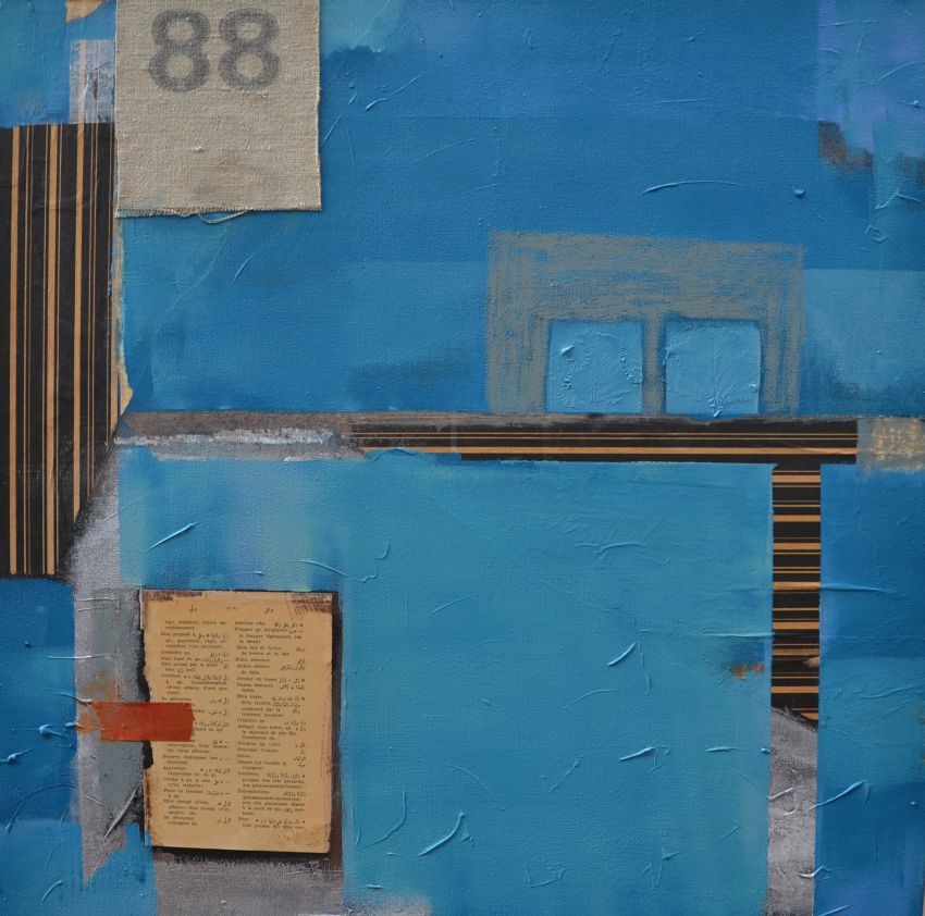 Collage en acryl met diverse materialen: papier, stukje postzak. Dit schilderij is in 2013 geveild in 't Hijgend Hert in Breda tbv Alpe d'HuZes.