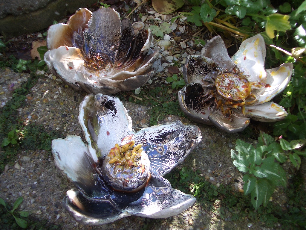 3 lotusbloemen in keramiek....handvormen, glazuur en rookstook.