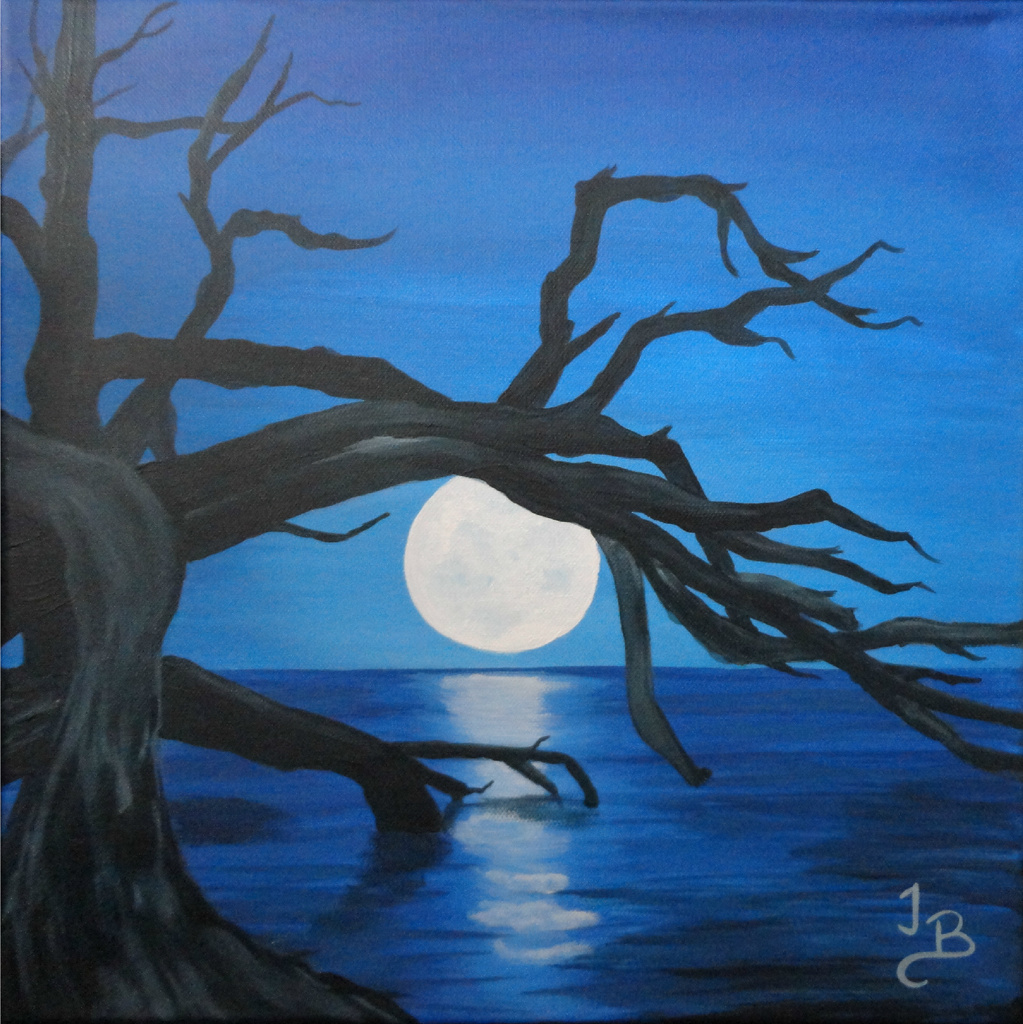 Dode boom hangend over water bij een prachtige blauwe lucht en een volle maan die mooi schittert op het water.