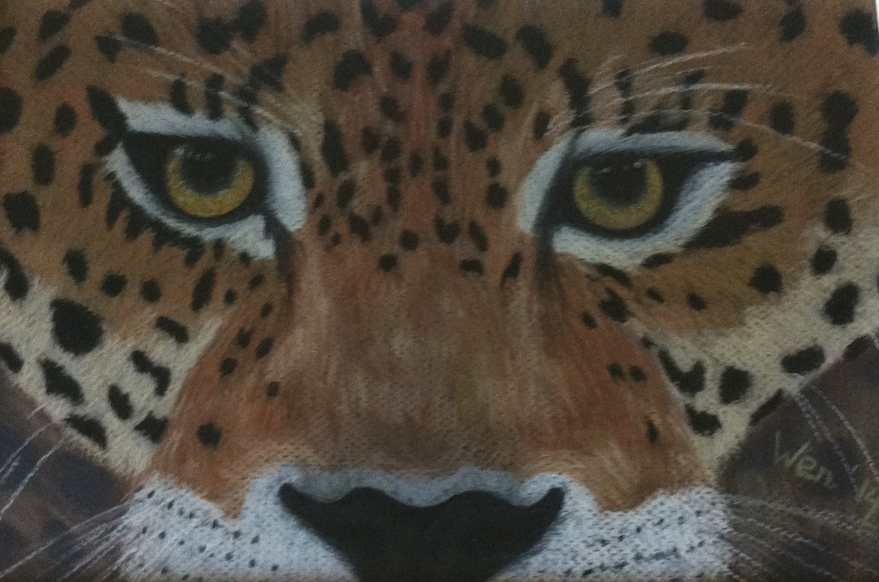 aanblik luipaard, gemaakt met rembrandt pastel, achter glas