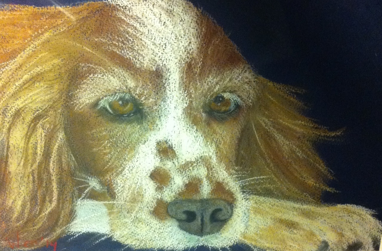 noah de hond gemaakt met rembrandt soft pastel, achter glas