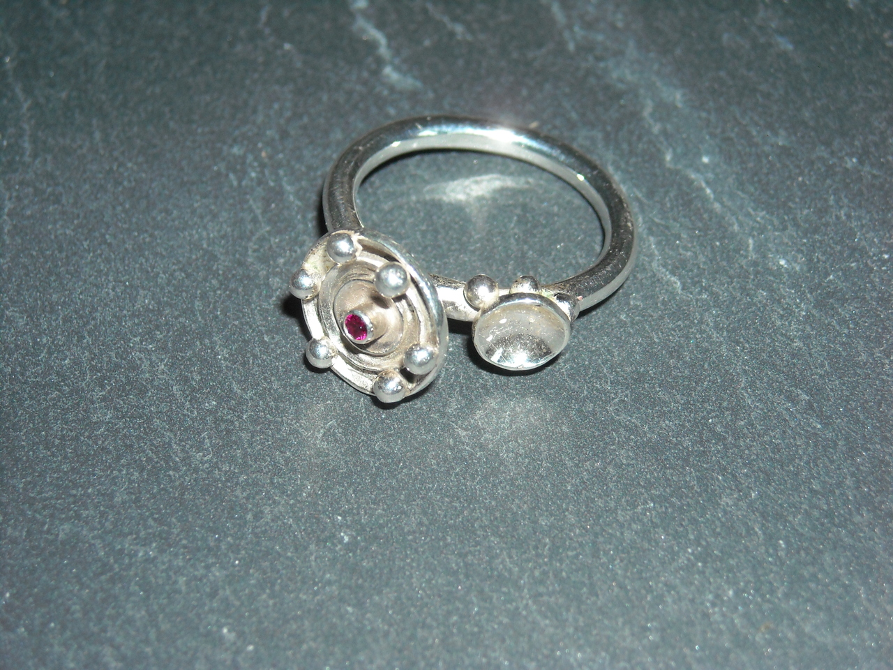 Ring met bakjes en granulles van zilver (925) en kleine rode zirkonia maat18
