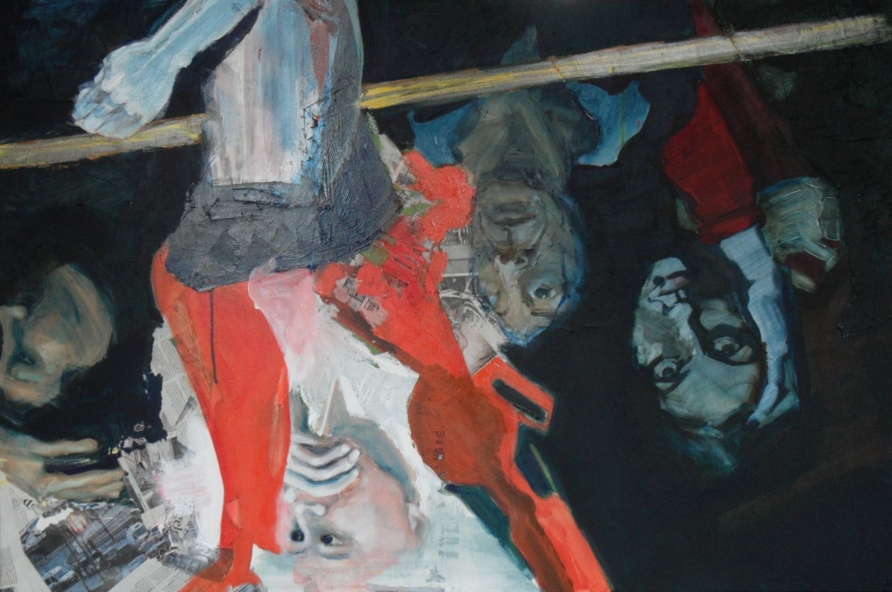 Wit Figuratief Oranje Blauw Acryl Bruin Papier Abstraherend Verhalend Contrast Straatbeeld