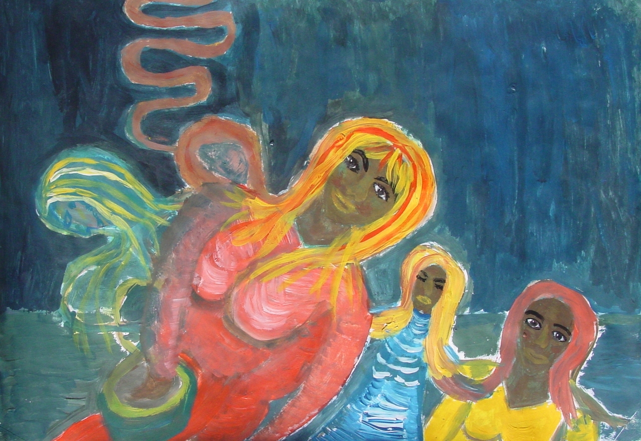 Ik begin dit werk abstract en gaandeweg wordt het meer figuratief; een impressie van de goede tijd die ik heb met andere vrouwen op Bulamu Village in Bombo (Oeganda)