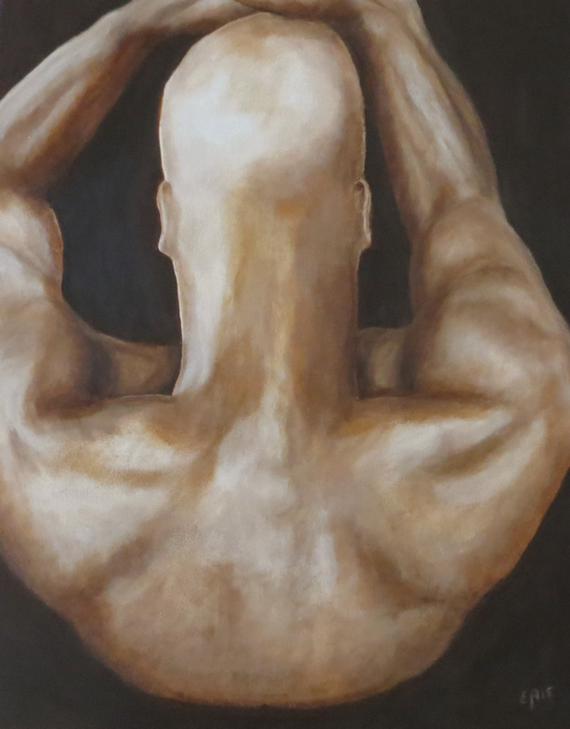 wanhoop en vertwijfeling komen naar voren in dit schilderij uitgevoerd in bruintinten.