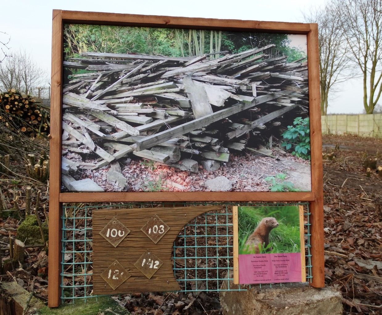 Tekens en de naakte feiten Na de sluiting van de farm / waren stapels hout / and kleine nummerplaatjes / de enige resten / samen met blauw-groen gaas. De Naakte feiten: Nertsfarm Hesska Mink / Provincie Utrecht, Nederland / Start ongeveer 1972 / Zo'n 20.000 kooien / In 28 jaar / 1 miljoen nertsen gedood. (Dank aan "Bont voor Dieren" voor foto van wilde nerts) Assemblage / collage van foto, hout, metaal en woord