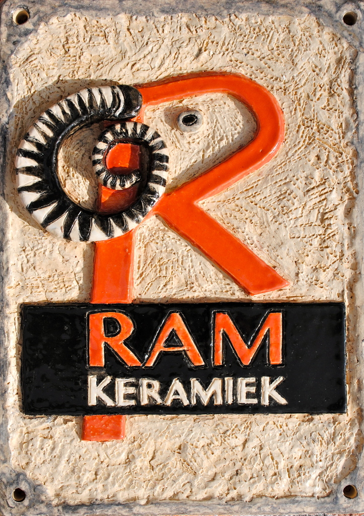 In relief uitgewerkt logo van Ramkeramiek in aardewerk.