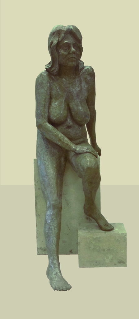 In polyester uitgevoerde modelstudie van half-zittend vrouwelijk naakt. Afwerking: brons imitatie.