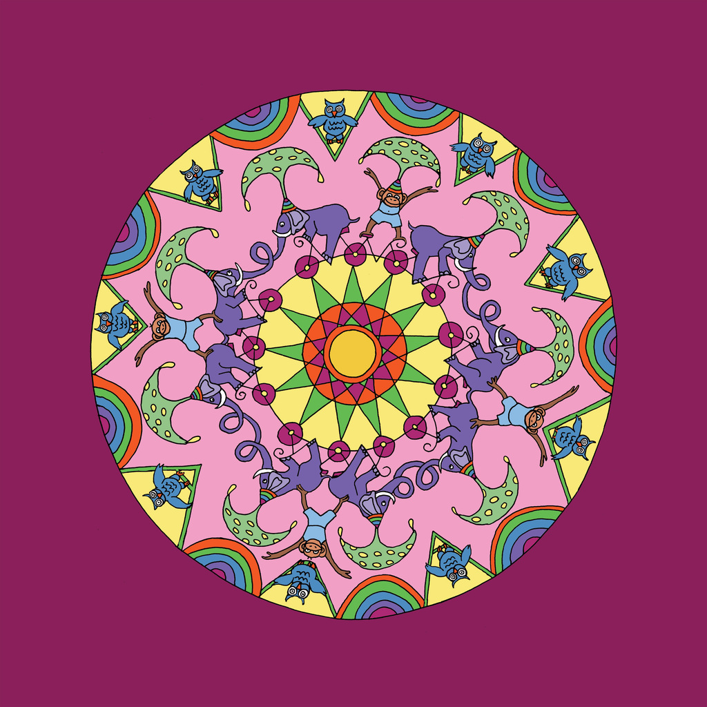 kleurrijk tafareel met aapjes, olifantjes en uiltjes in mandala vorm.