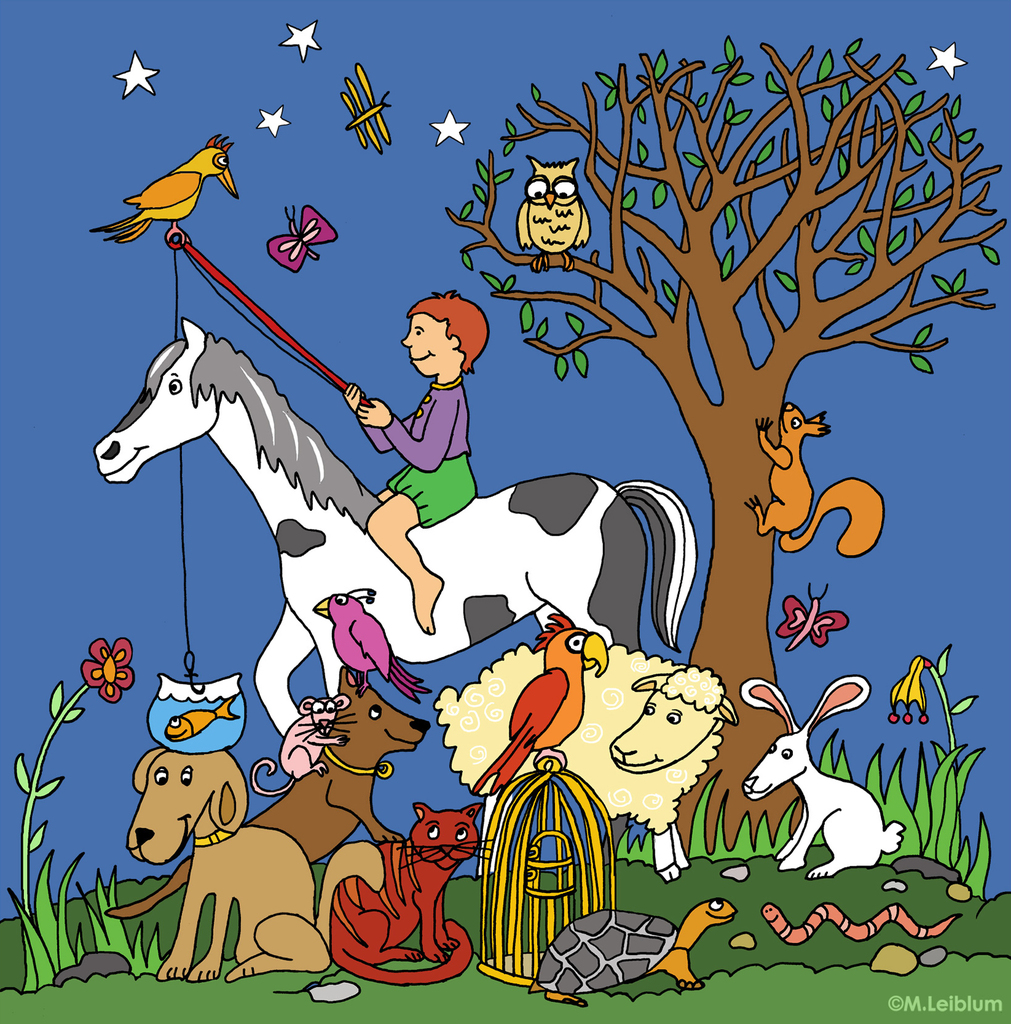 Illustratie voor kinderkaart van een jongetje op paard met zijn lievelingsdieren om hem heen. Kleurrijk en vrolijk.