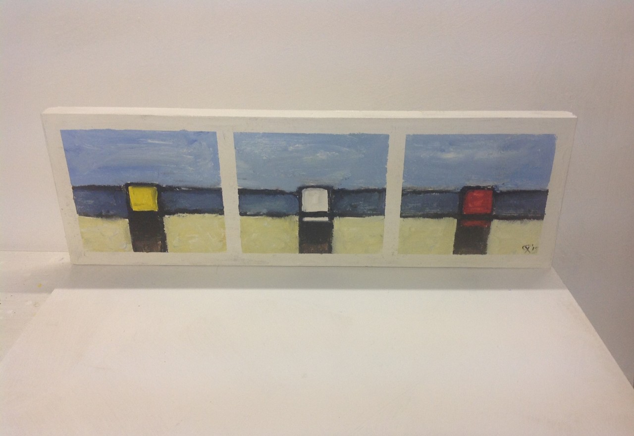 Compositie aan zee. Drieluik strandpalen. 20 x 60 x 3 cm. VERKOCHT.