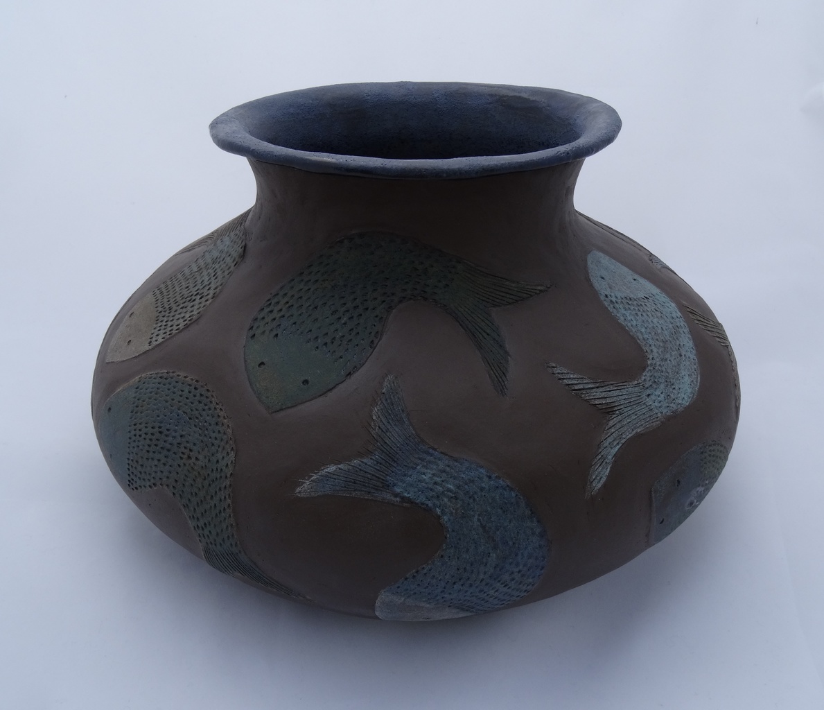 Met de handgevormd uit zwartbakkende klei. Gedecoreerd met vissen in relief, afgewerkt met sinterengobe.