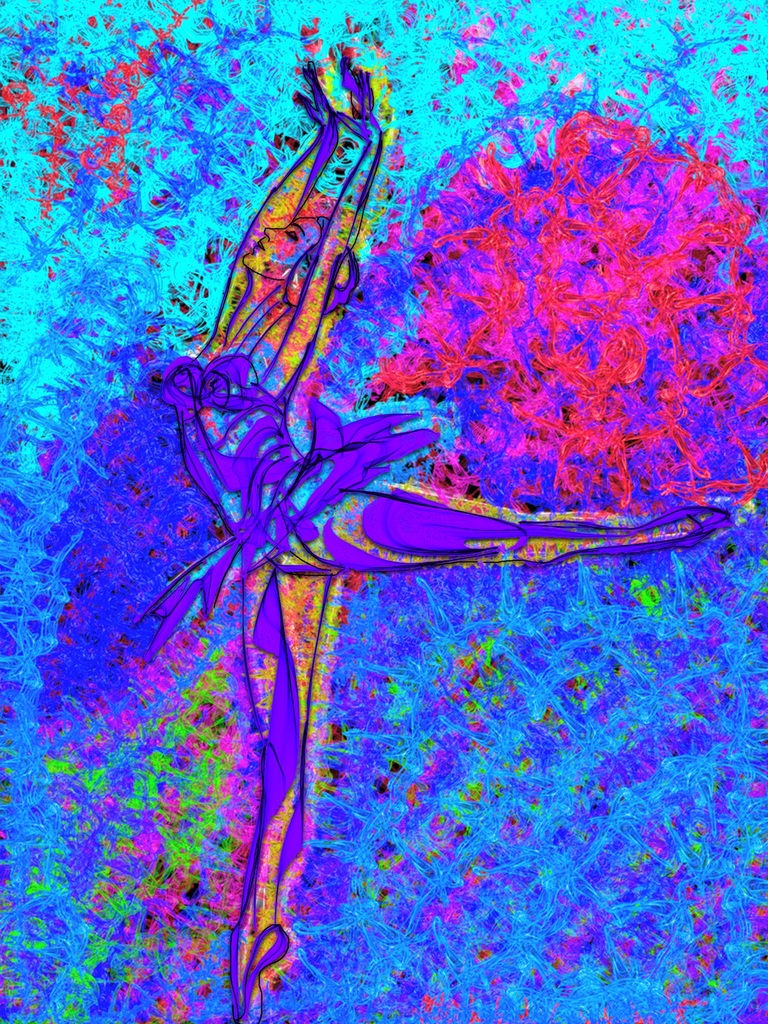 Het werk is opgebouwd uit allemaal danseressen zoals deze op de voorgrond staat. Af te drukken in verschillende formaten en op diverse ondergronden b.v plexiglas