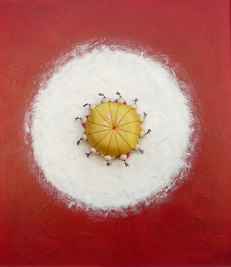 Acryl schilderij op houten paneel over oud schilderij heen geverfd, met daarop gelijmd een gebruikt speldenkussen.