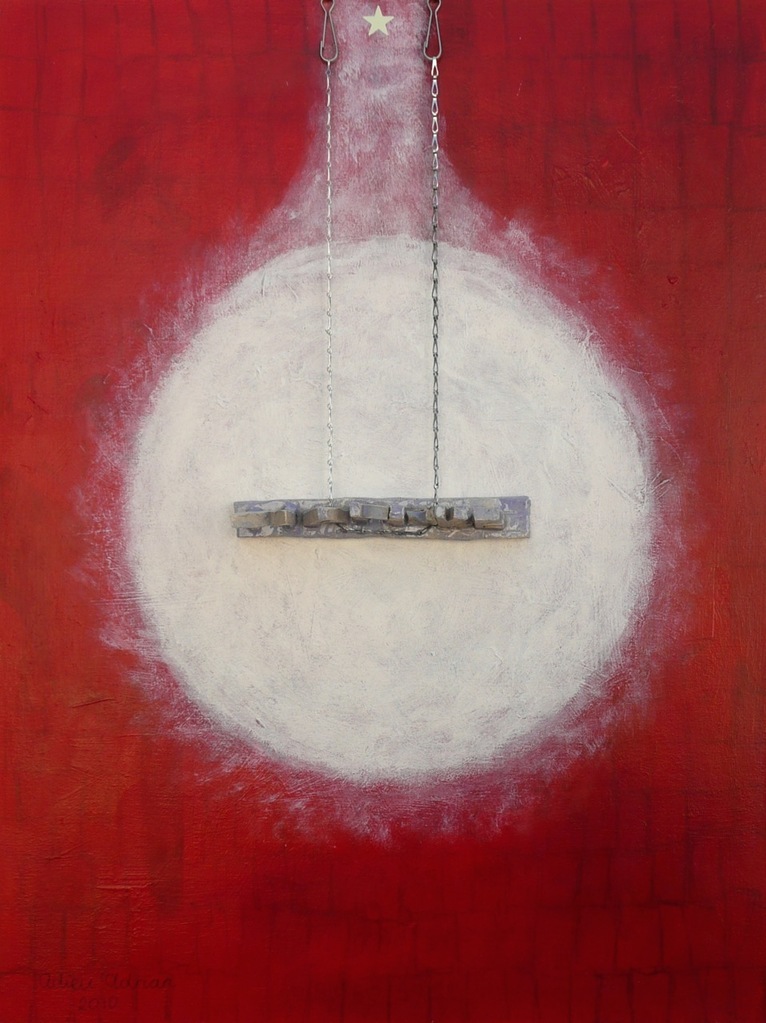 Acyl schilderij op houten paneel over oud schilderij heen geverfd, met erop een kleiwerkje hangend aan een ketting.