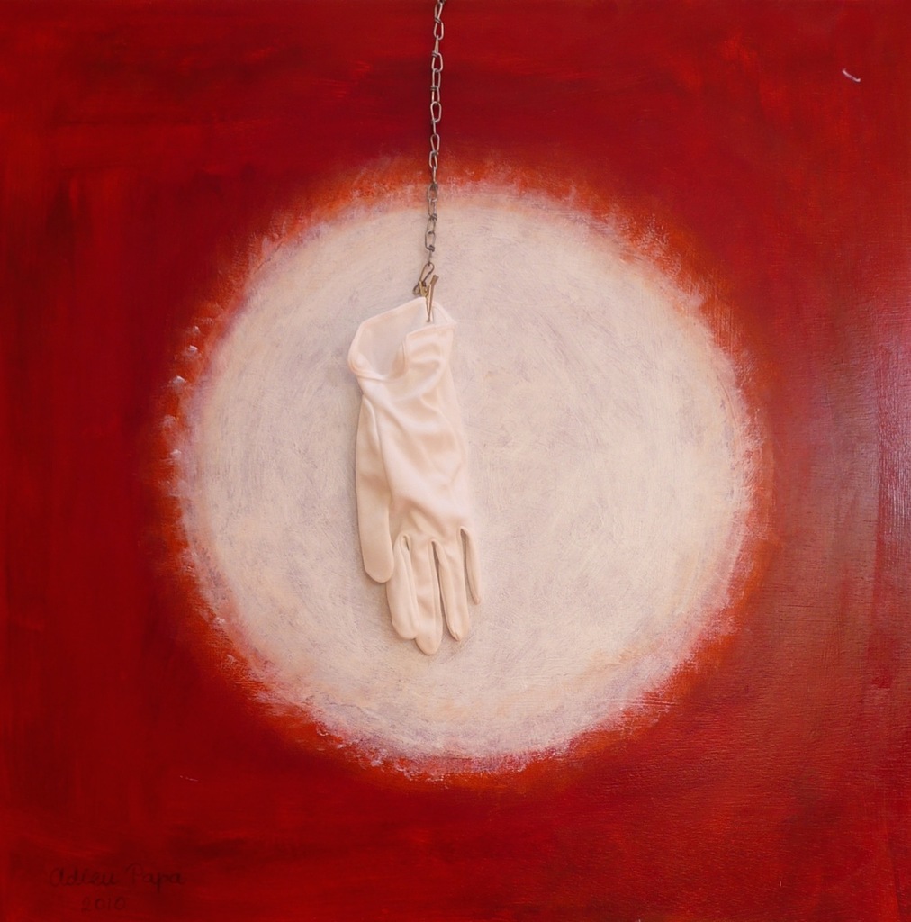 Acryl schilderij op houten paneel, met erop een witte stoffen handschoen hangend aan een ketting.