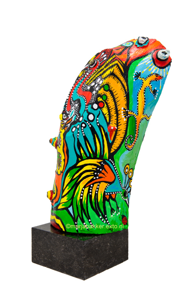 "DE WORTEL VAN GELUK " BESCHILDERDE BOOMSTAM OP SOKKEL. De boomstam staat voor..............de natuur. De hagadis staat voor..................de droom naar beter . De pauw staat voor......................geluk,maar tevens symboliseert het,het boze oog, (de consumptiemaatschappij) De feniks, aan de achterzijde staat voor de wedergeboorte naar een betere samenleving. De kleuren staan voor het opwekken van blijheid,en een geluksgevoel.