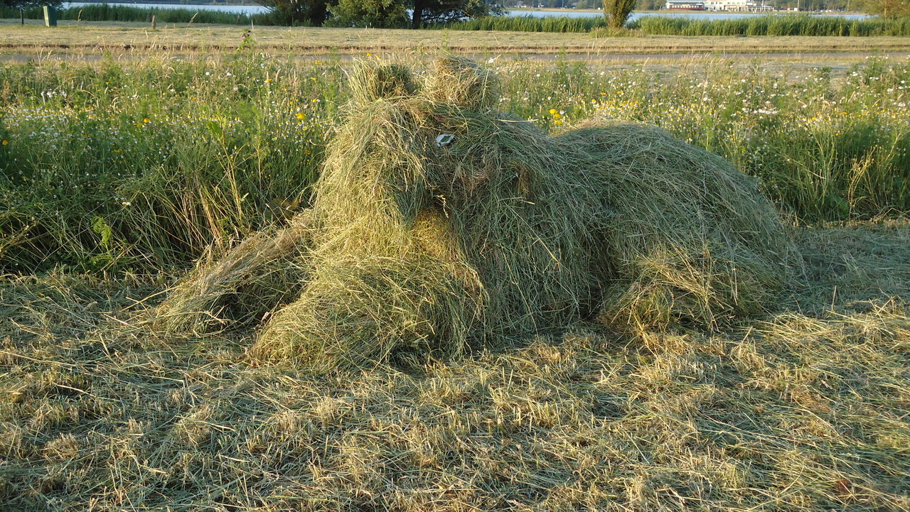 Het eerste hooi van het jaar 2015, lekker geurig en goed vormbaar. Met de hooidieren wil ik de aandacht vestigen op het in hoog tempo uitsterven van diersoorten. Ondanks de verhalen over de vinken op de galapagos die verschillende snaveltjes ontwikkelden is er in de laatste tienduizend jaar geen nieuw dier bijgekomen, zeer waarschijnllijk ook niet in de laatste hnderd duizend jaar. We verliezen dus alleen maar soorten. De biodiversiteit in de wereld loopt heel hard achteruit, ook wat planten betreft. We realiseren ons te weinig dat alles met alles verbonden is en dat we afhankelijk zijn van wat de natuur ons schenkt. Je kunt iets doen. Begin met over te schakelen op biologische producten. Biologische landbouw laat de natuur heel veel beter in tact. En let op jouw ecologische voetafdruk.