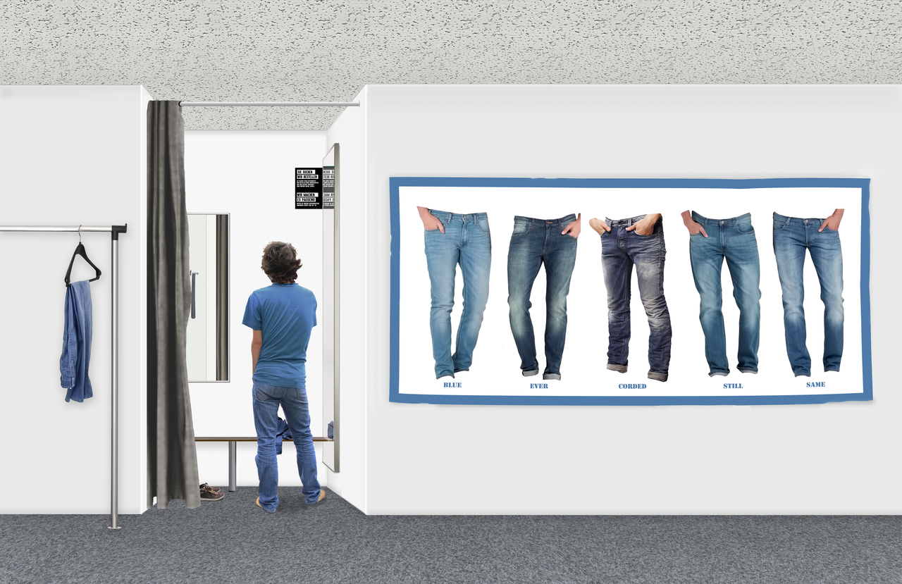 Een jonge man past een jeans. Hij heeft de keuze uit verschillende soorten blauw en soms zwart. Maar uiteindelijk is het altijd een jeans.