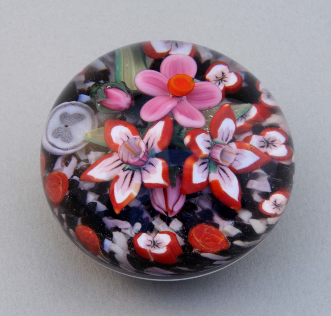 Mini presspapier, circa 200 gram. Ontwerp binnenzijde is gemaakt aan de brander. Door middel van de vacuumencasement techniek zijn de bloemen in het blanke glas geplaats en als laatste stap met de brander rond gevormd.