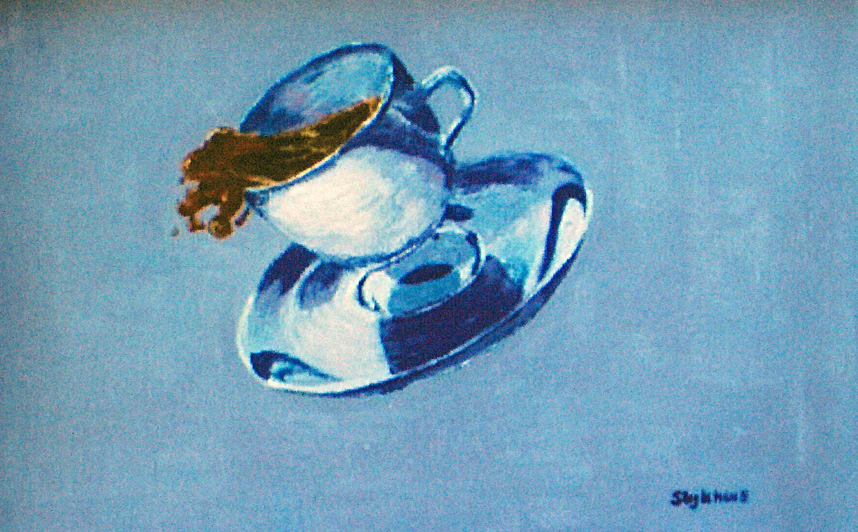 Een schilderij van een koffiekopje met schotel gemaakt op een dienblad.