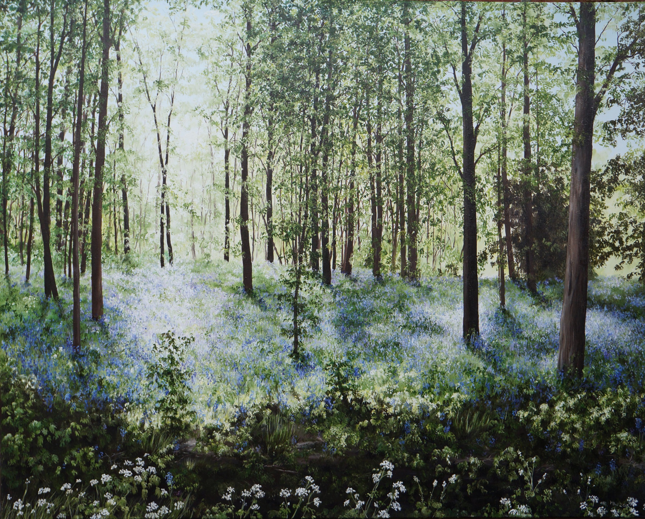 Olieverfschilderij van een bos met boshyacinten.