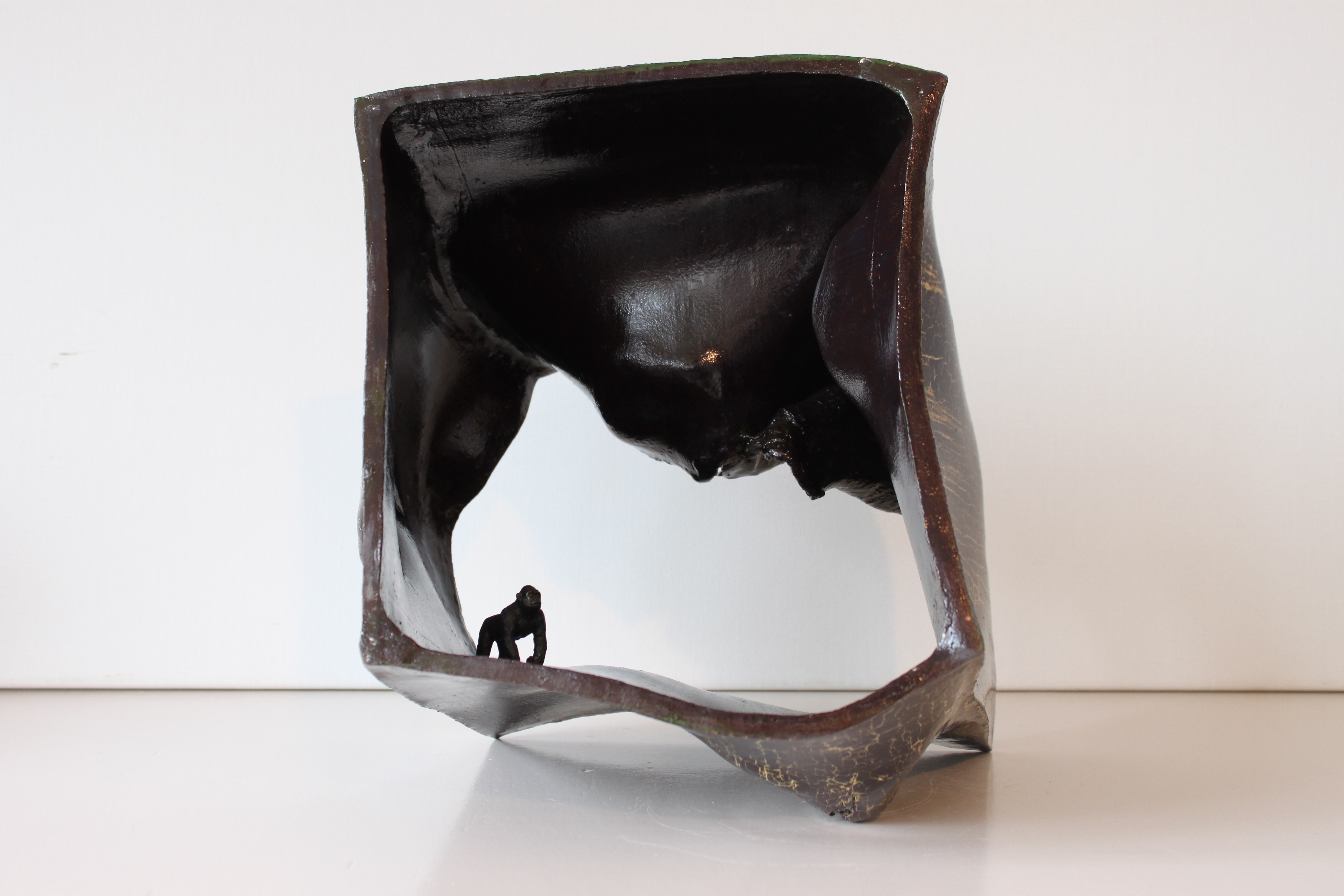 Dit keramisch werk met kleine plastic aap gaat terug naar onze oorsprong. maar de vierkante grot verwijst naar het heden.