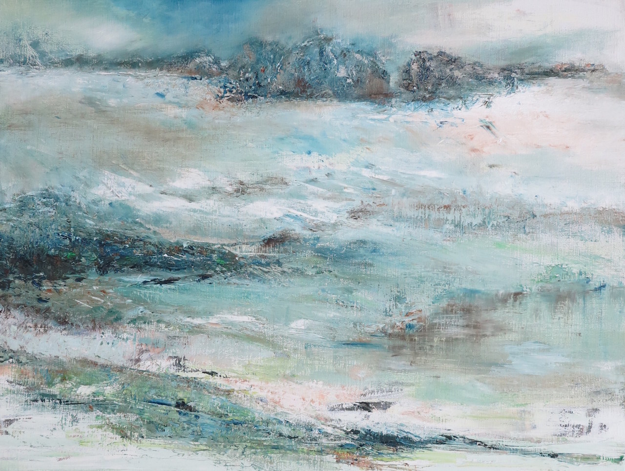 Het land ligt er verlaten bij, maar kijkend naar dit schilderij dringen de geluiden van water en wind zich aan je op.