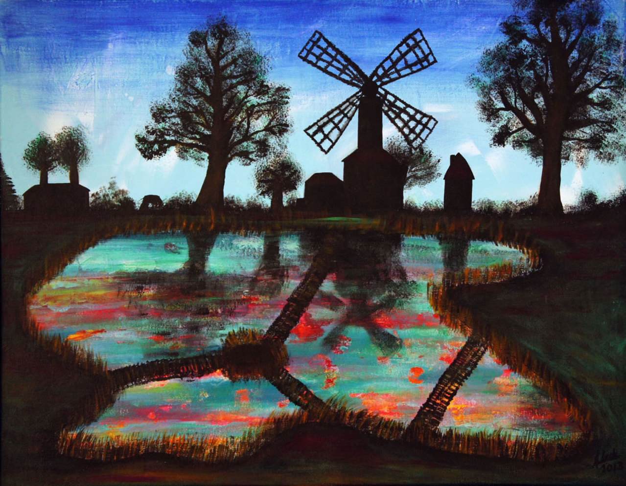 molens aan het water met mysterieuze zonsondergang in het water