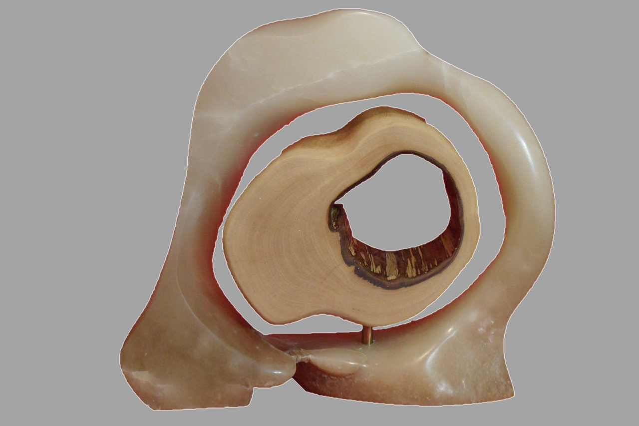 Between the Materials 3 is gemaakt van Brown Albast met Perenhout erin gemonteerd.