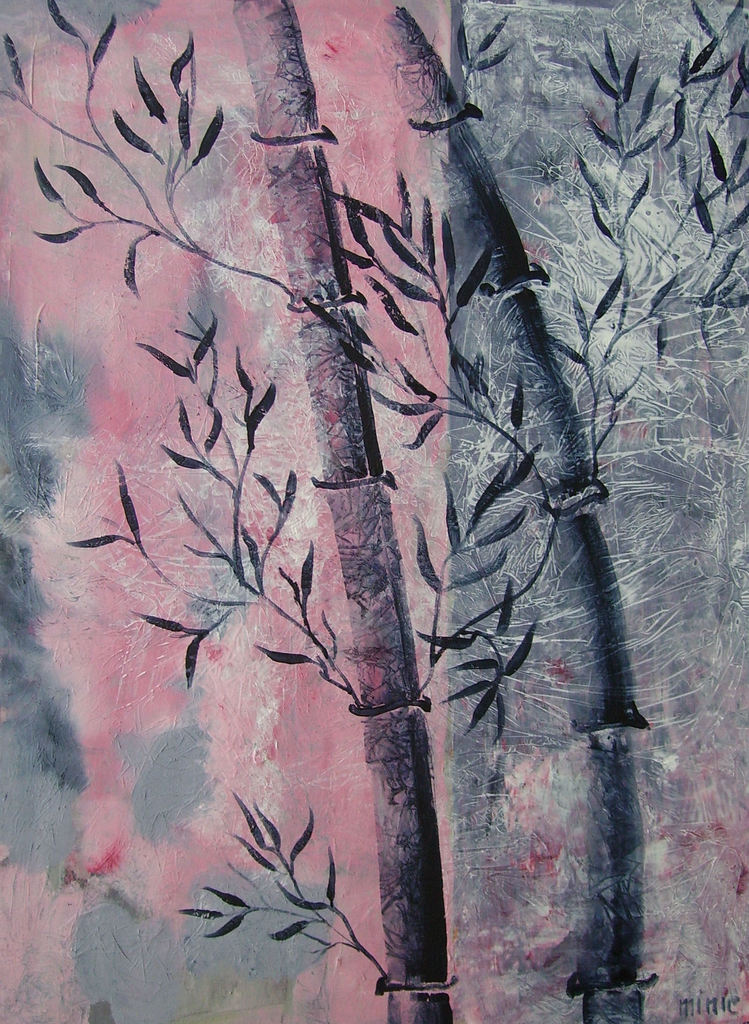 In vele lagen transparant opgezet schilderij. De bamboe is geschilderd volgens de originele Japanse schildertechniek.