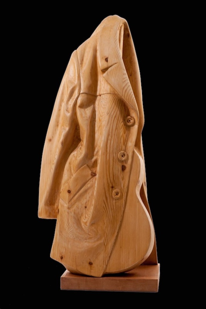 GITAAR EN JAS Materiaal: Hout H 110 – B 45 – D 30 cm Gewicht: 23 kilo Muziek is verboden in Iran, vooral de westerse muziek, van klassiek tot jazz, pop, blues, of welke stijl dan ook. Zelfs de traditionele instrumenten en de bespelers van de traditionele instrumenten mogen op televisie niet verschijnen. Men mag niet optreden. Muziek wordt illegaal gedownload en stiekem geluisterd. Dat, allemaal, heeft Mansoor Chitzan geïnspireerd om een reeks beelden te realiseren in de vorm van muziekinstrumenten die bijna niet te zien zijn. Elk instrument is bijna geheel gesluierd en “De sluiering van de beelden” slaat op alles wat verboden en verborgen moet blijven.
