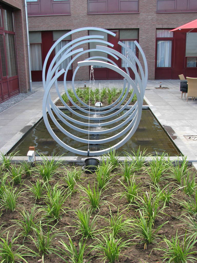 In de tuin van een zorgcentrum heb ik een plan gemaakt omvattende een vijver met direct daarnaast aanplant, In de vijver een scupltuur bestaande uit 7 verdraaide ringen van aluminium die samen een spiraal vormen. Erdoorheen spuit een fontein!