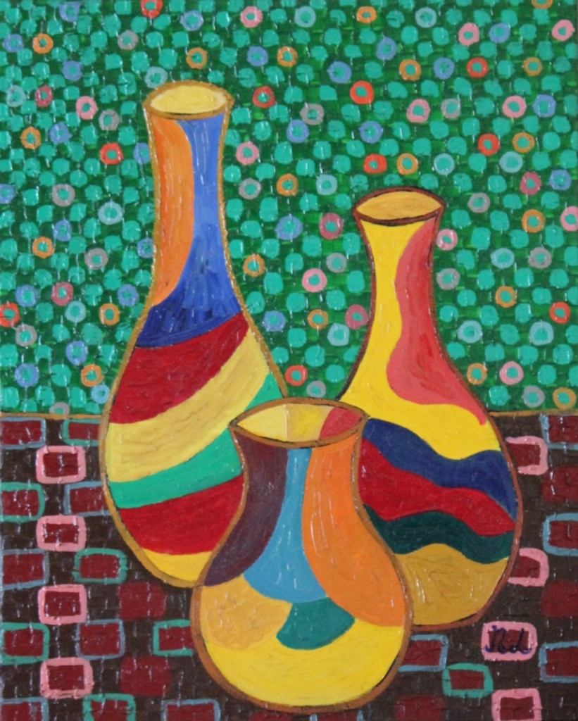 Olieverfschilderij. Jaar 2008 Dit levendige en speelse schilderij toont drie kleurrijke vazen met golvende patronen in felle tinten zoals geel, rood, blauw, groen en oranje. De vazen staan op een ondergrond die bestaat uit blokken in baksteenpatroon, met daarachter een wand van cirkels in groen- en blauwtinten, wat het geheel een mozaïekachtig effect geeft. De combinatie van kleurvlakken en patronen zorgt voor een dynamische en bijna abstracte compositie. Het werk straalt vrolijkheid, creativiteit en energie uit, en trekt direct de aandacht met zijn harmonieuze chaos.