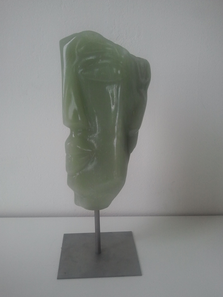 hoofd van groen chinees speksteen sokkel van roestvrijstaal