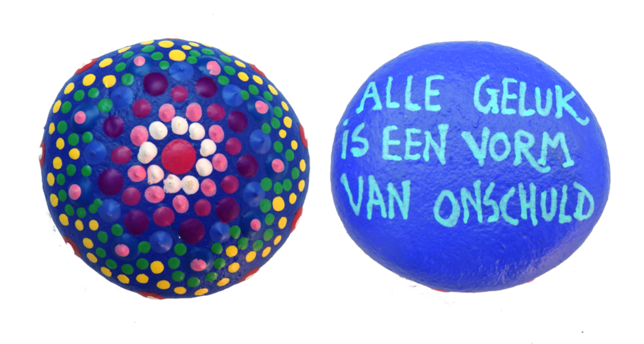 beschilderde steen met aan de ene kant dotpainting en aan de andere kant een spreuk "alle geluk is een vorm van onschuld"